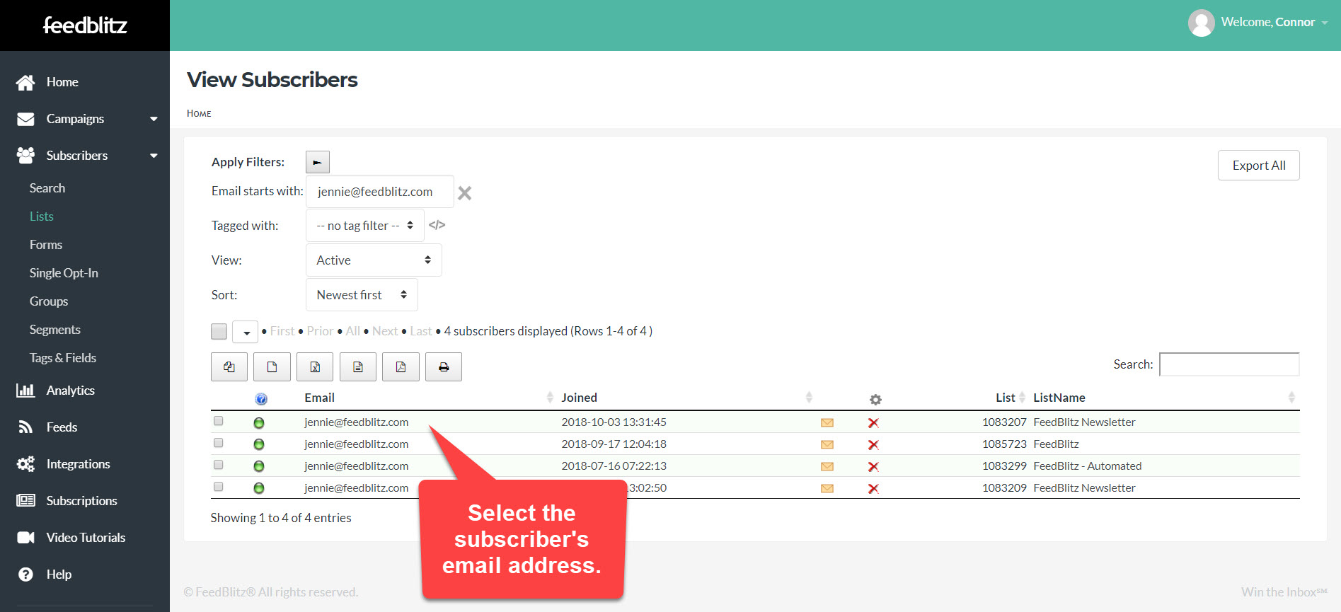 The following screen will display a table of results. Select the email address of the subscriber:
