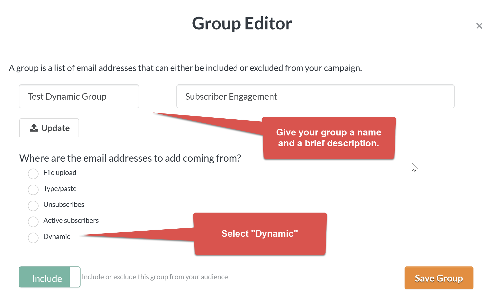 And the Group Editor will appear. Give your new group a name and a brief description Remember subscrbers are not notified when they're added to a group. They will not see this information.