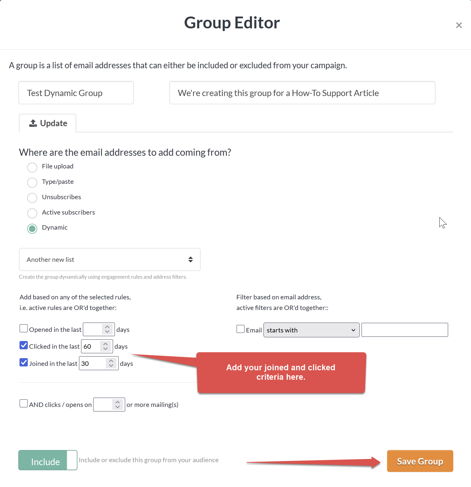 Once you select Dynamic, a series of criteria will appear. Add your joined and clicked parameters here and be sure to save the group when you’re finished.